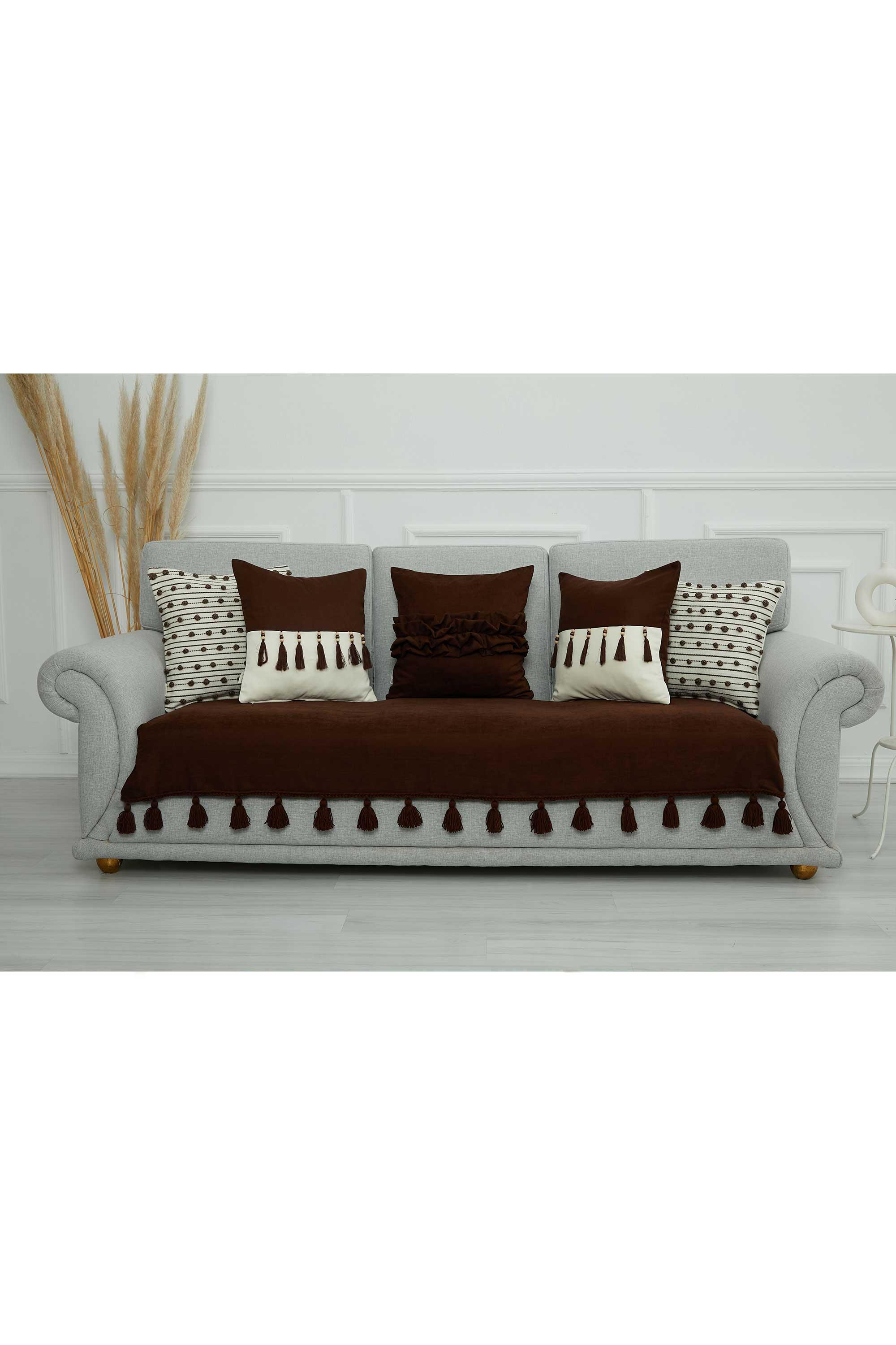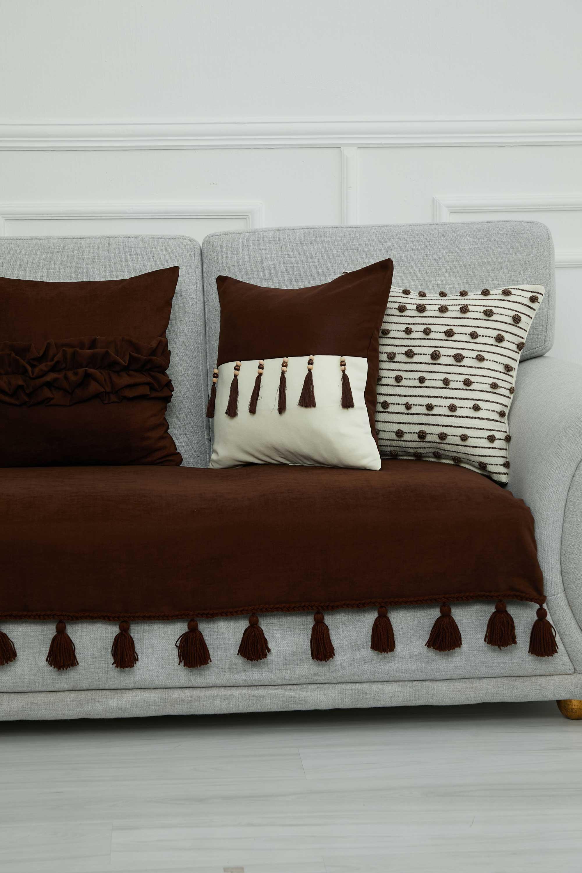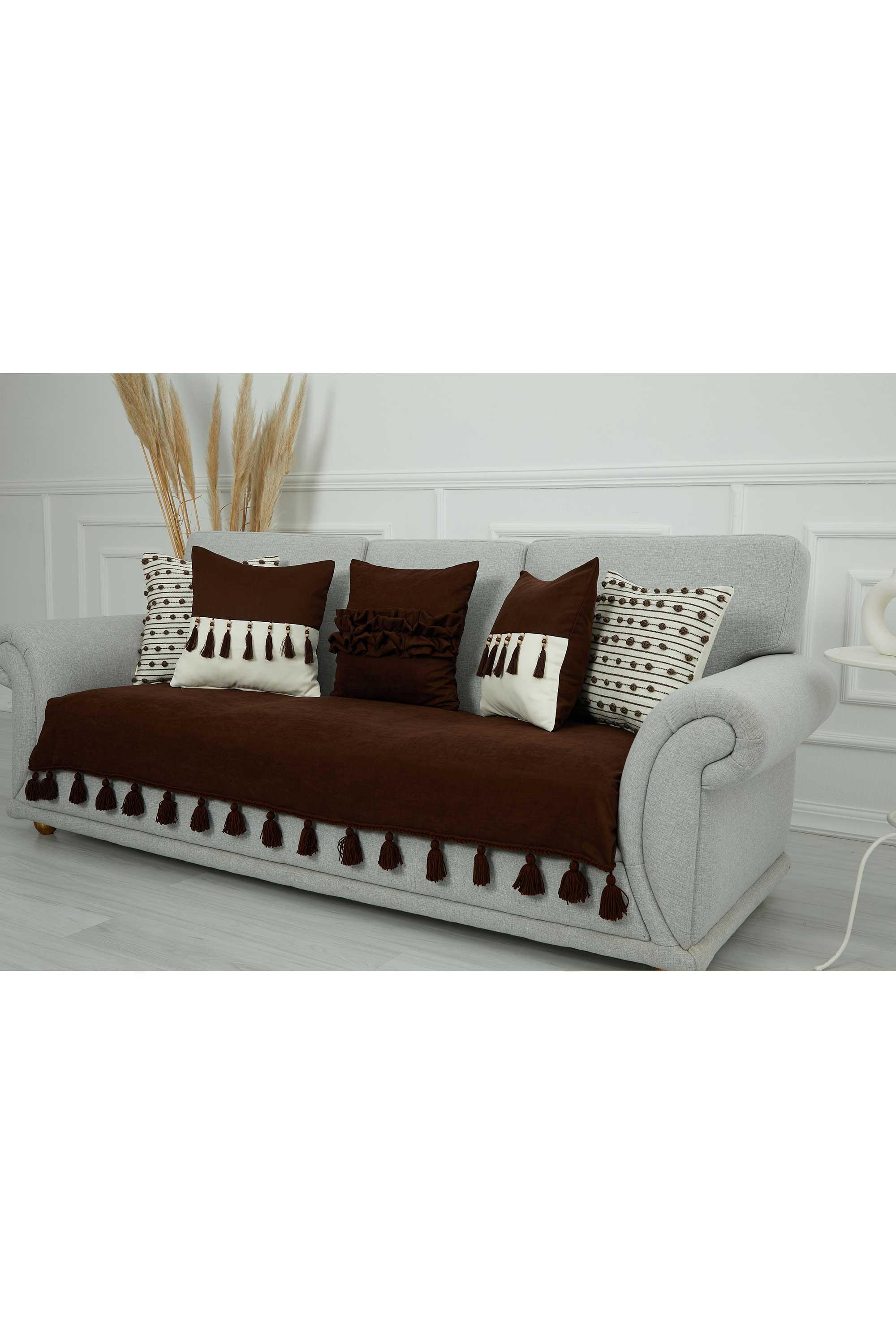 Örgü Kenar Detaylı Püsküllü Koltuk Örtüsü,KO-26 Kahverengi