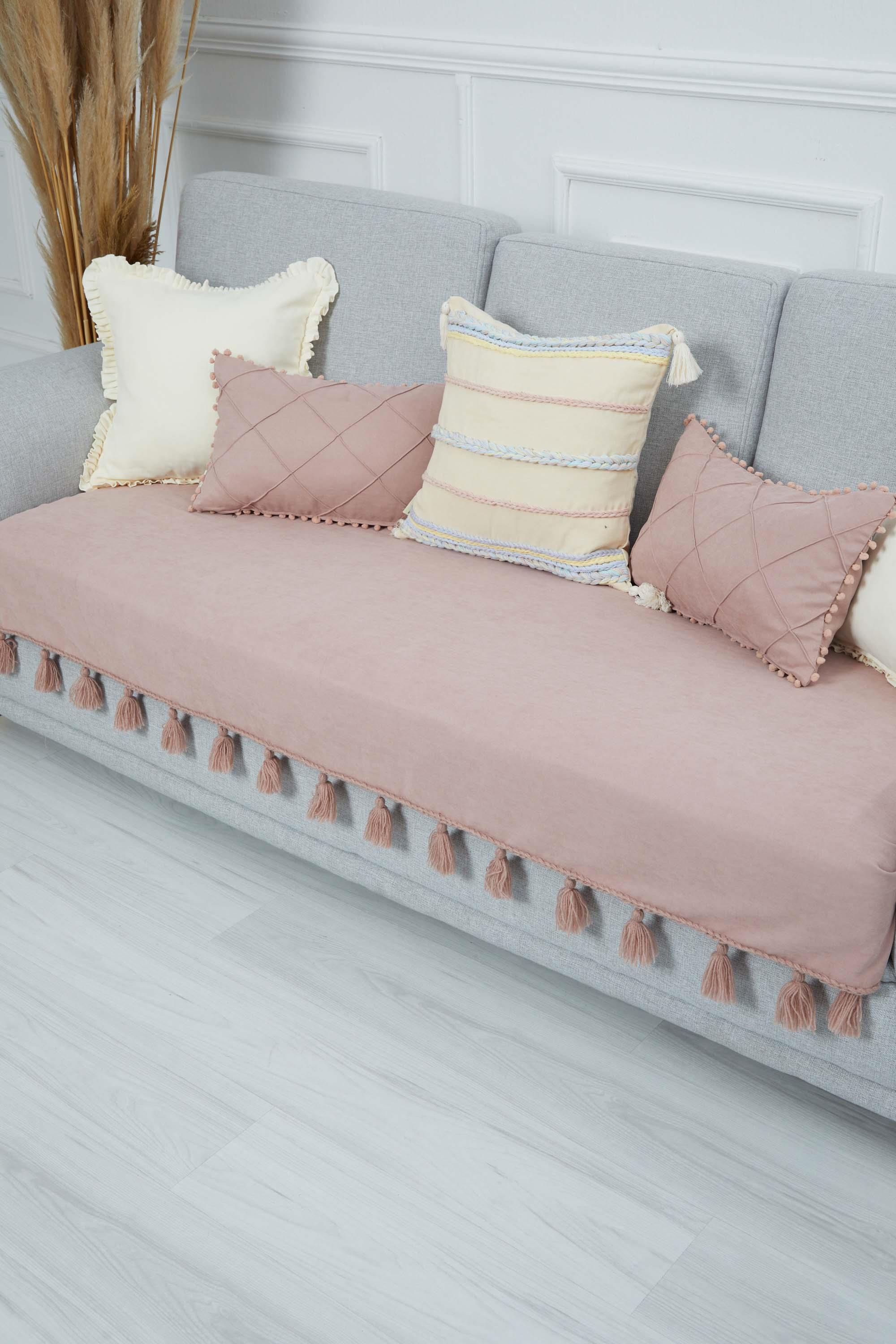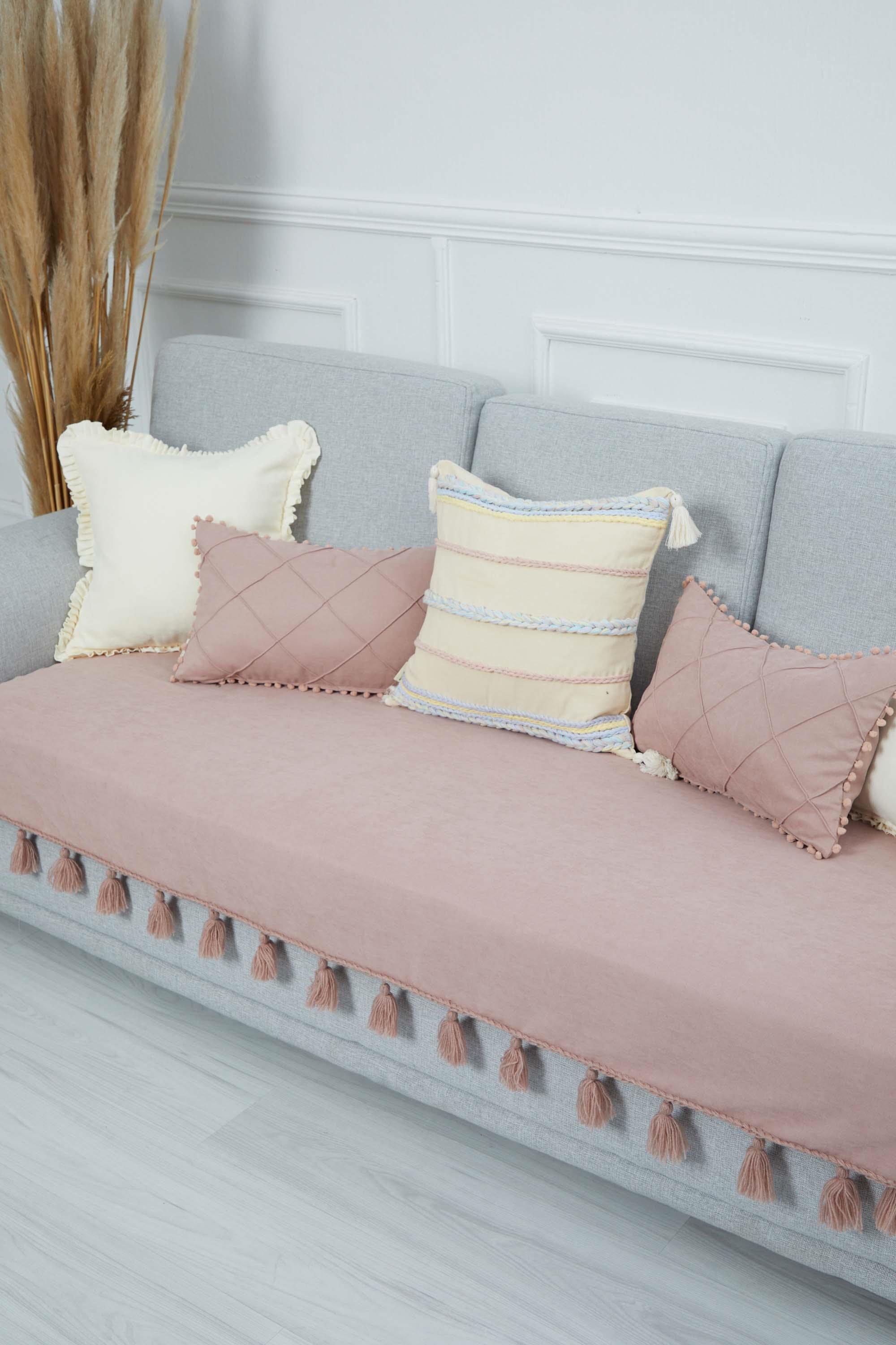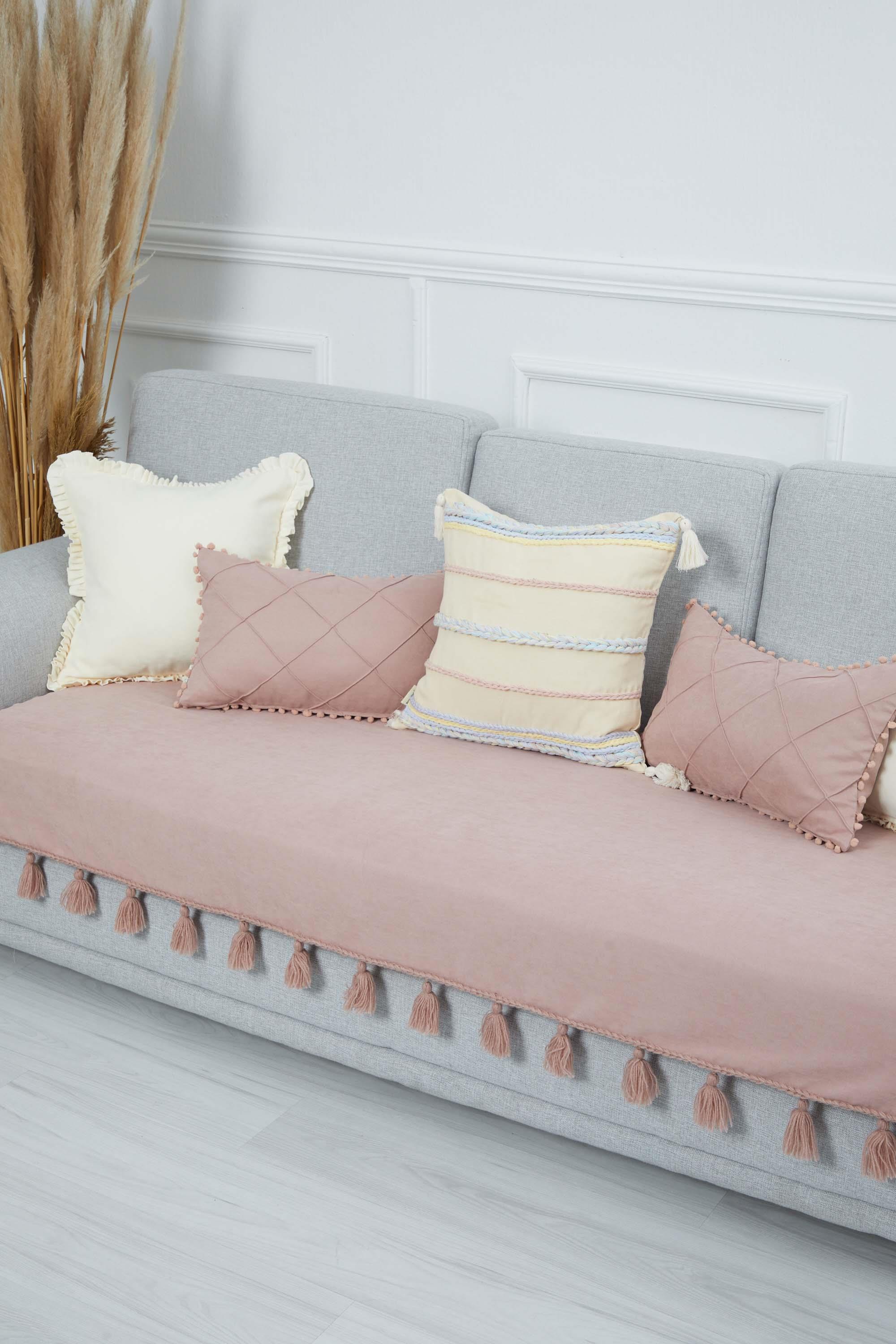 Örgü Kenar Detaylı Püsküllü Koltuk Örtüsü,KO-26 Pudra