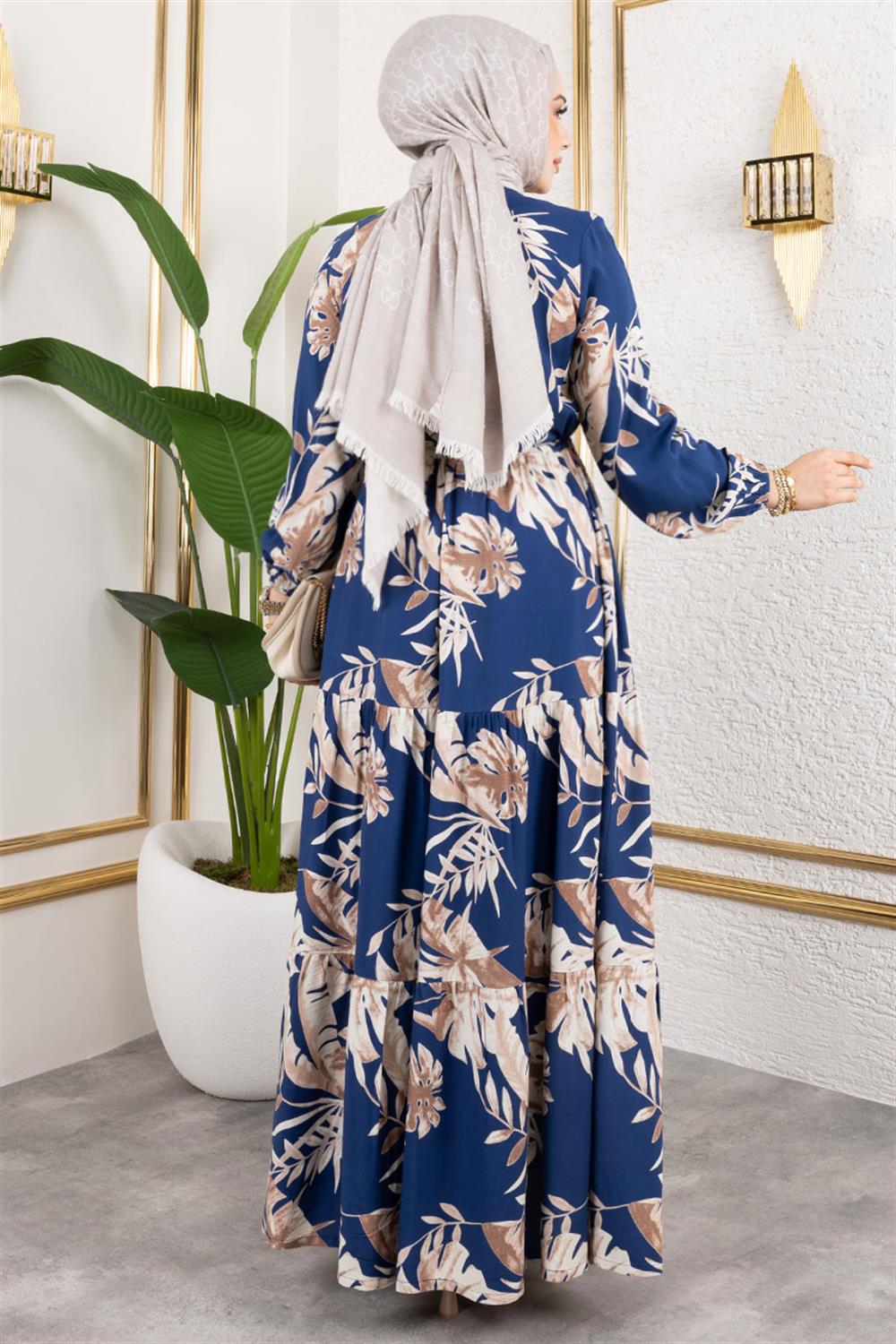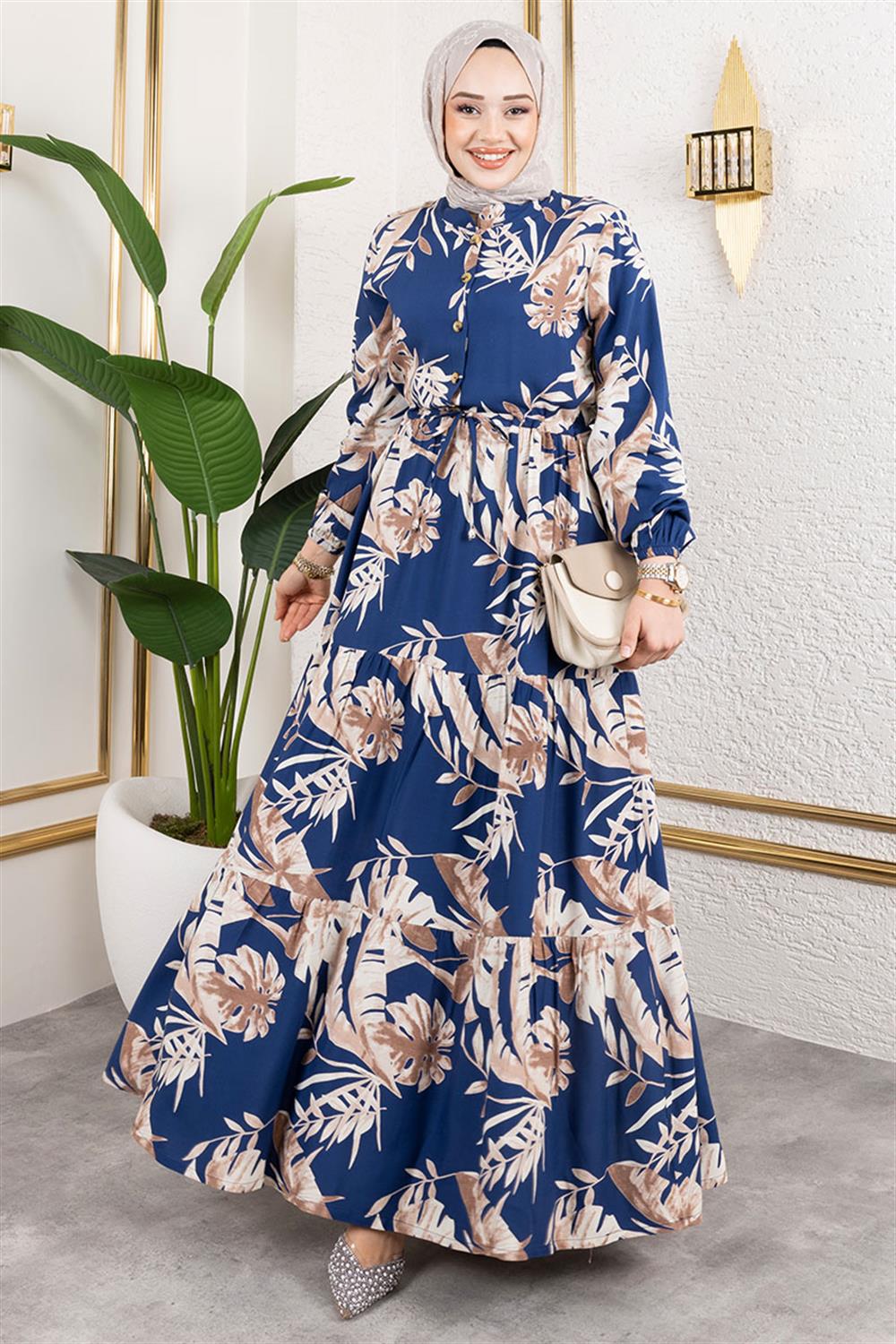 Palmiye Desenli Tesettür Elbise İNDİGO
