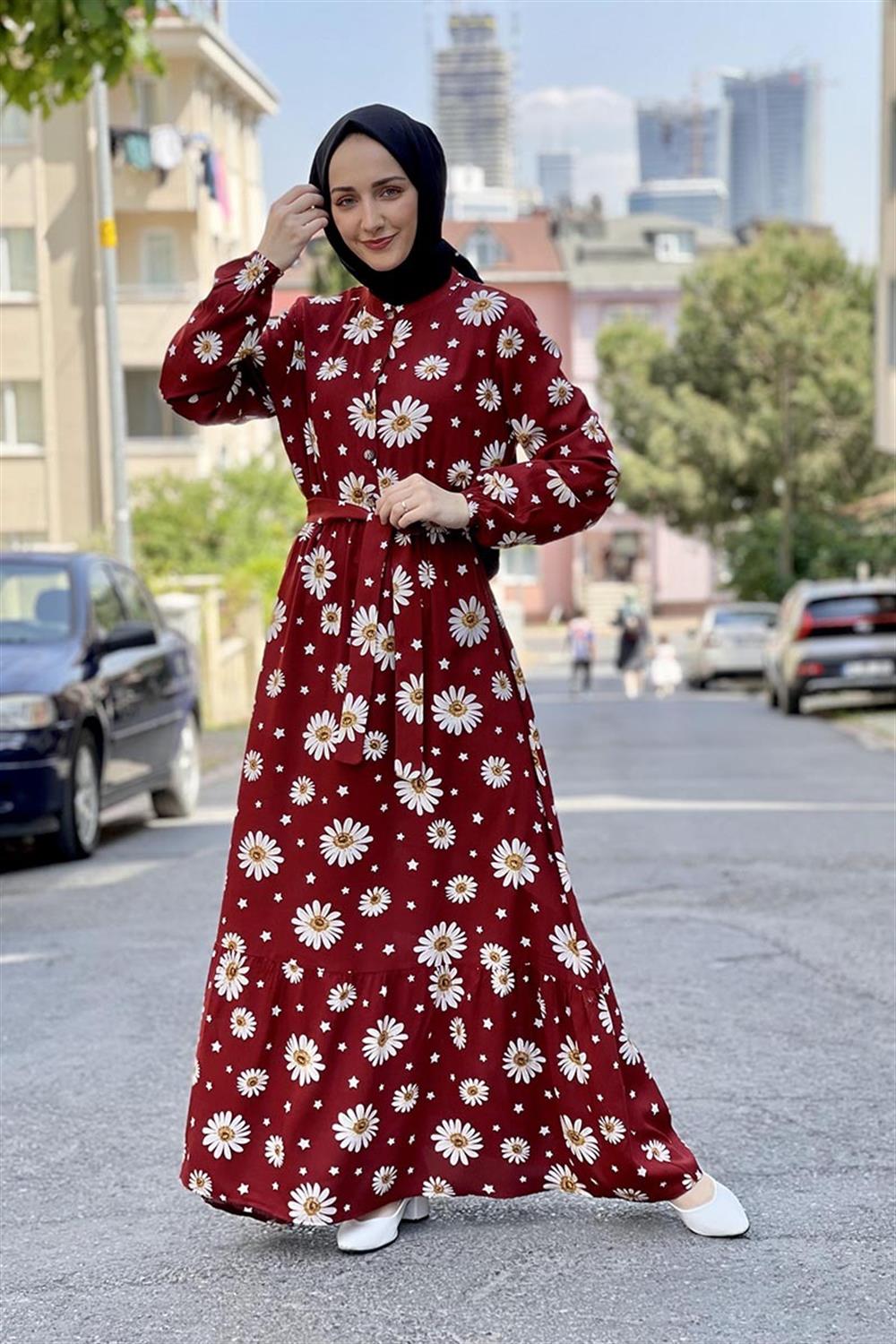 Papatyalı Viskon Elbise Bordo