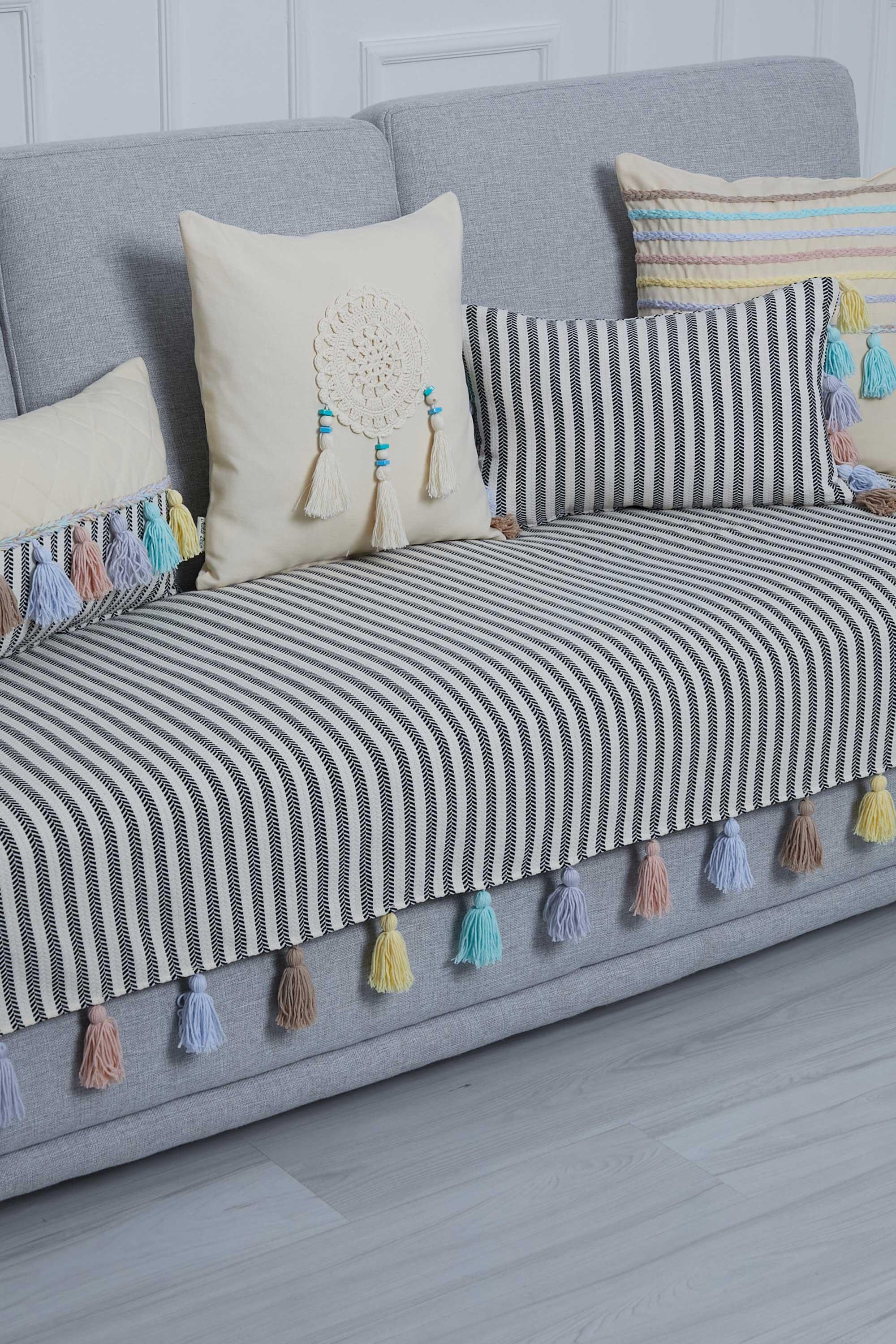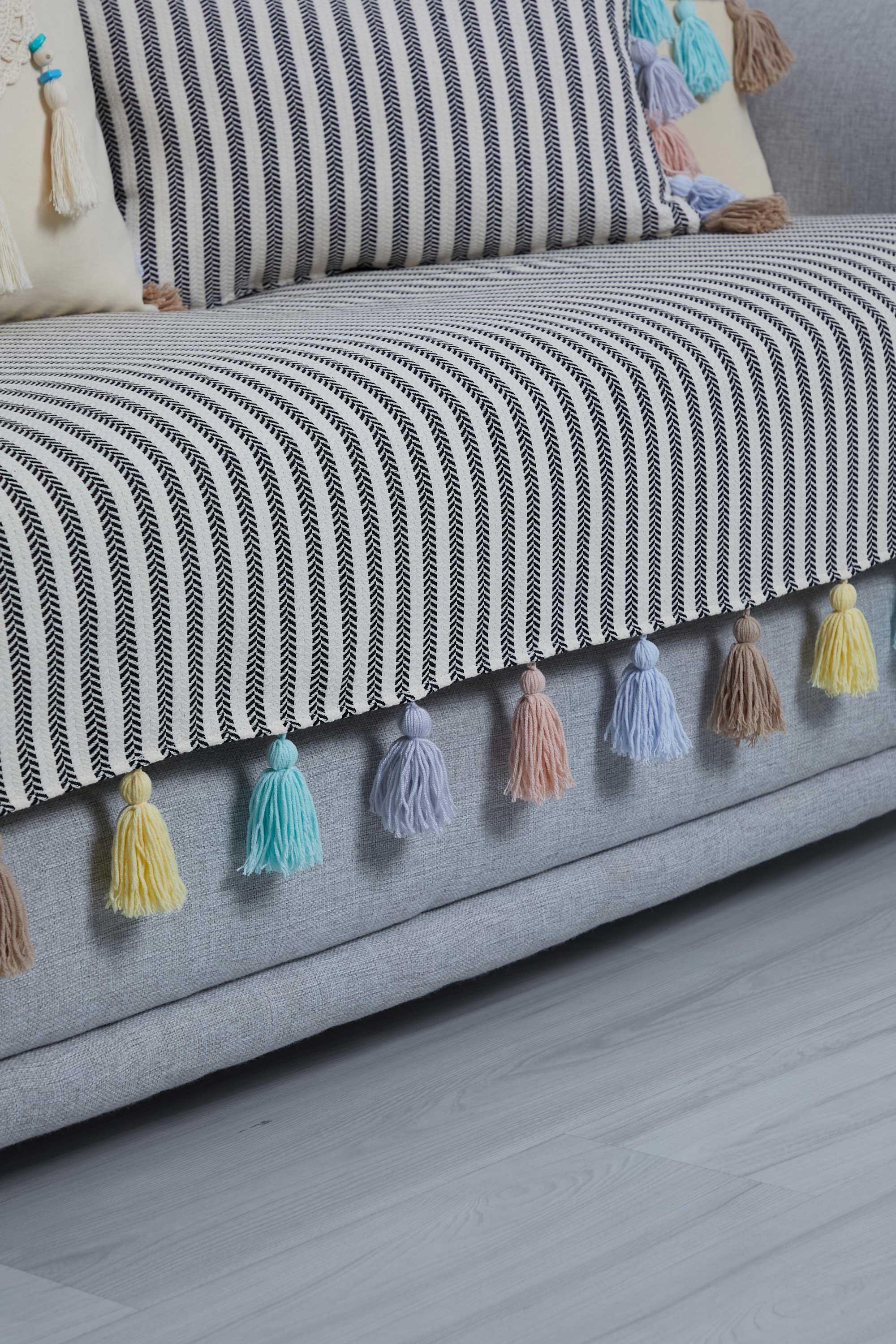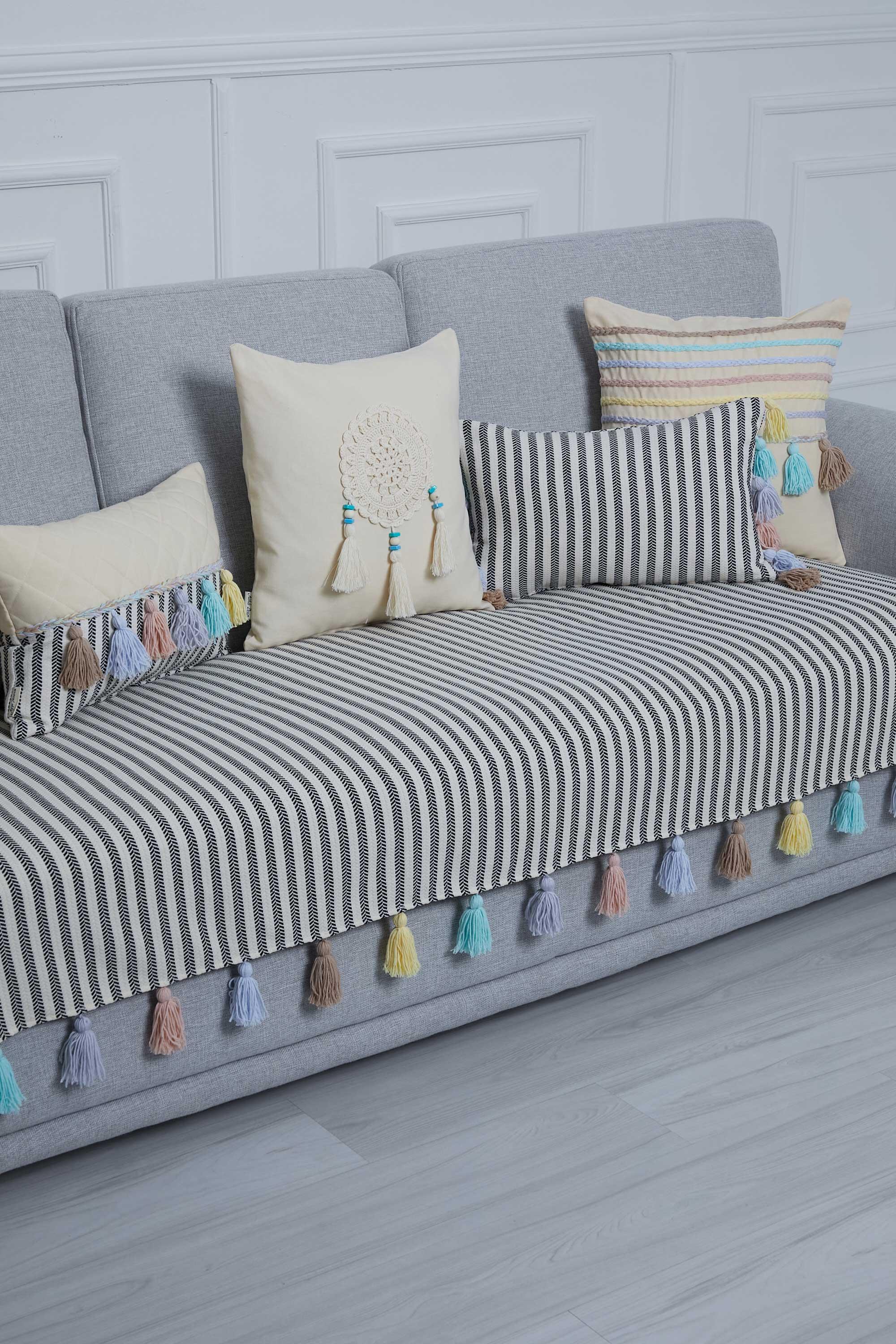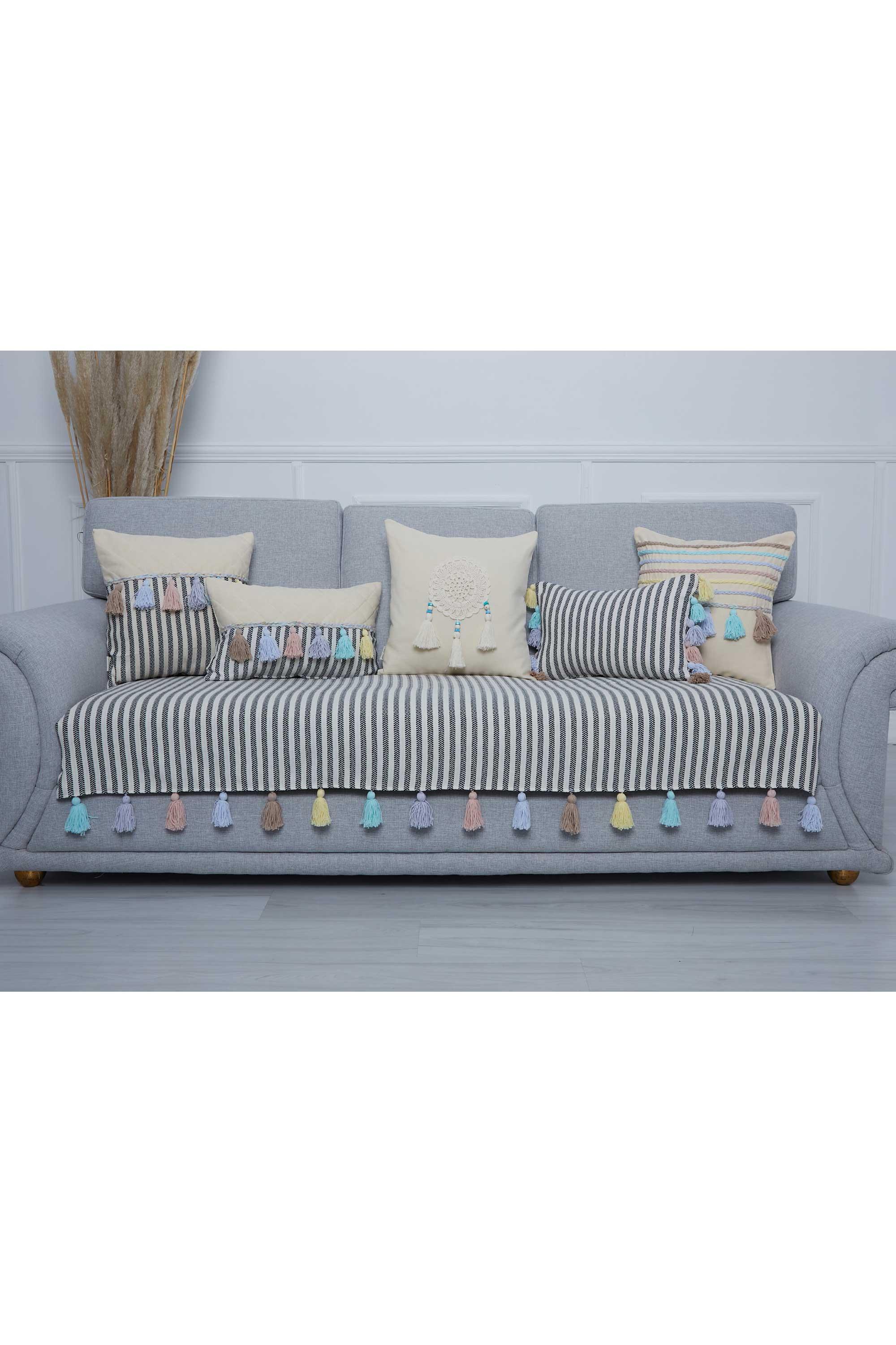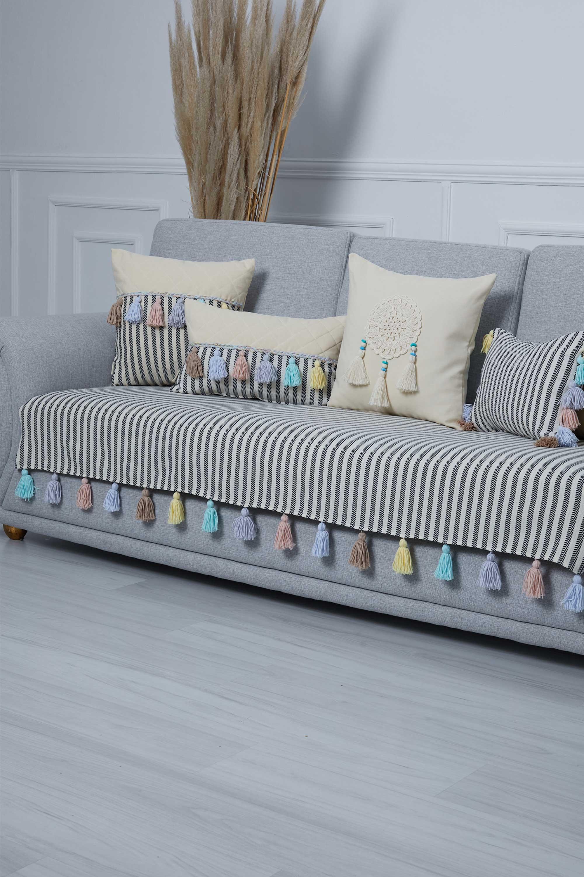 Renkli Püsküllü Koltuk Örtüsü 90 x 210,KO-20 Çizgili Desen - Mavi