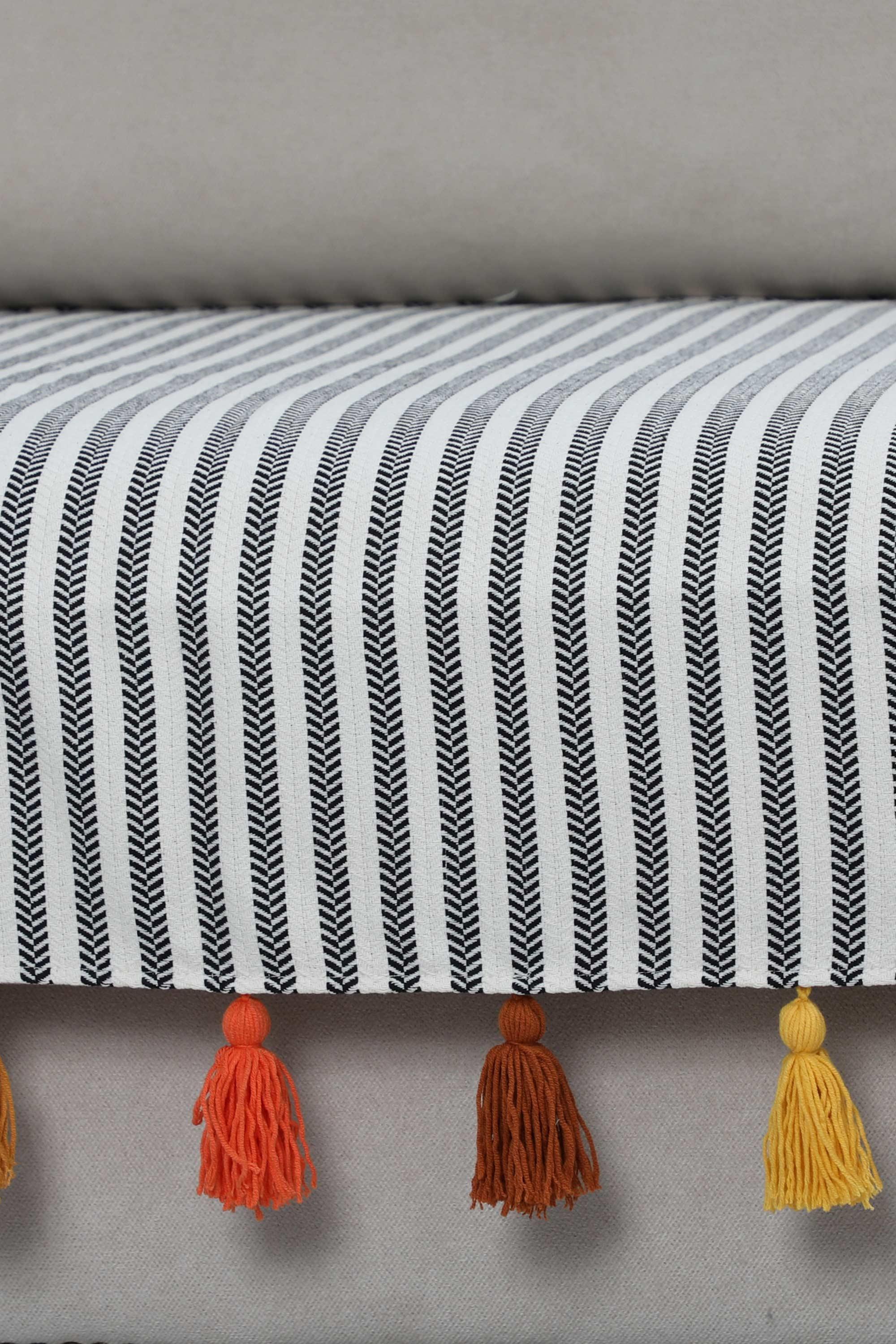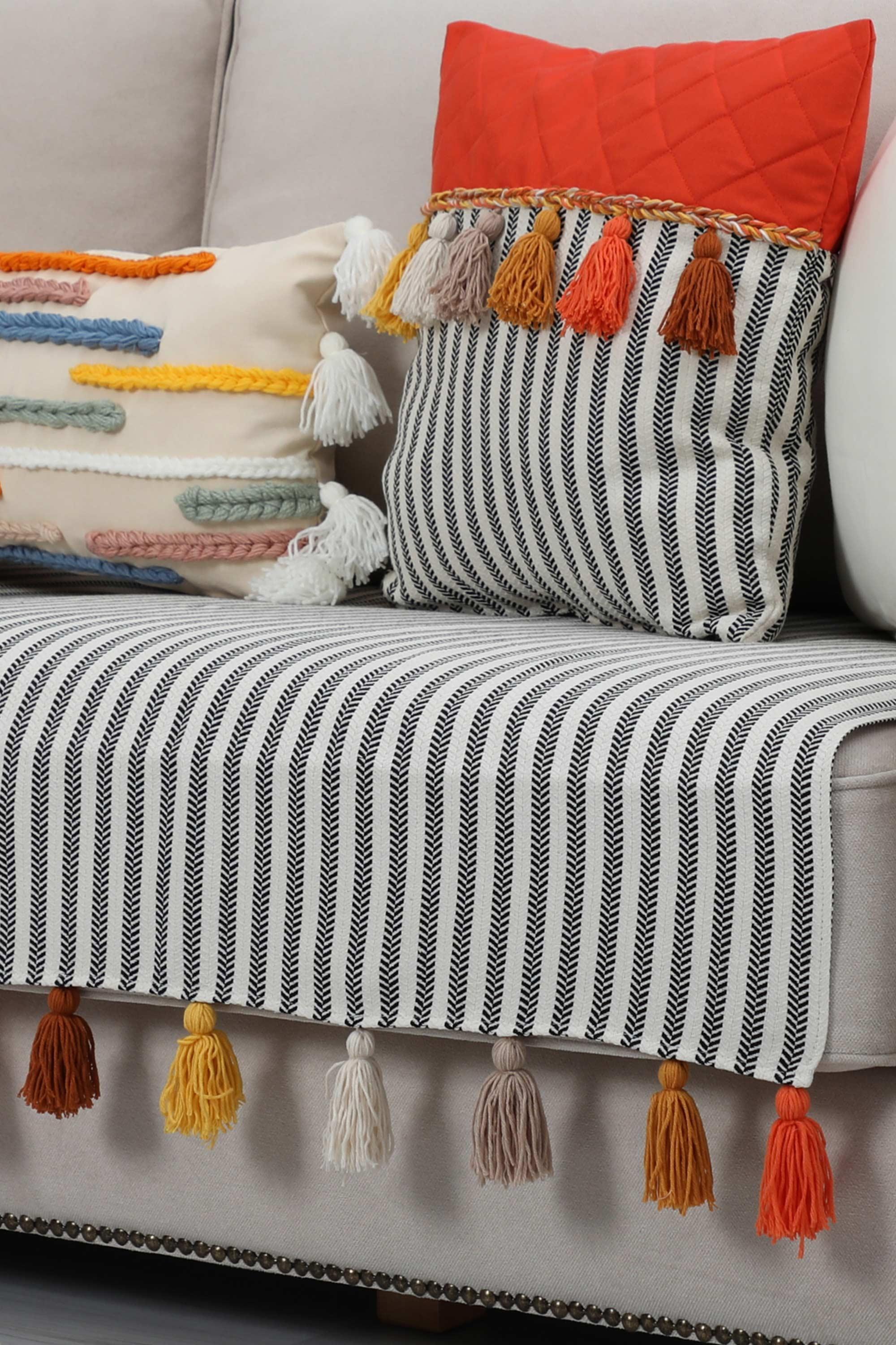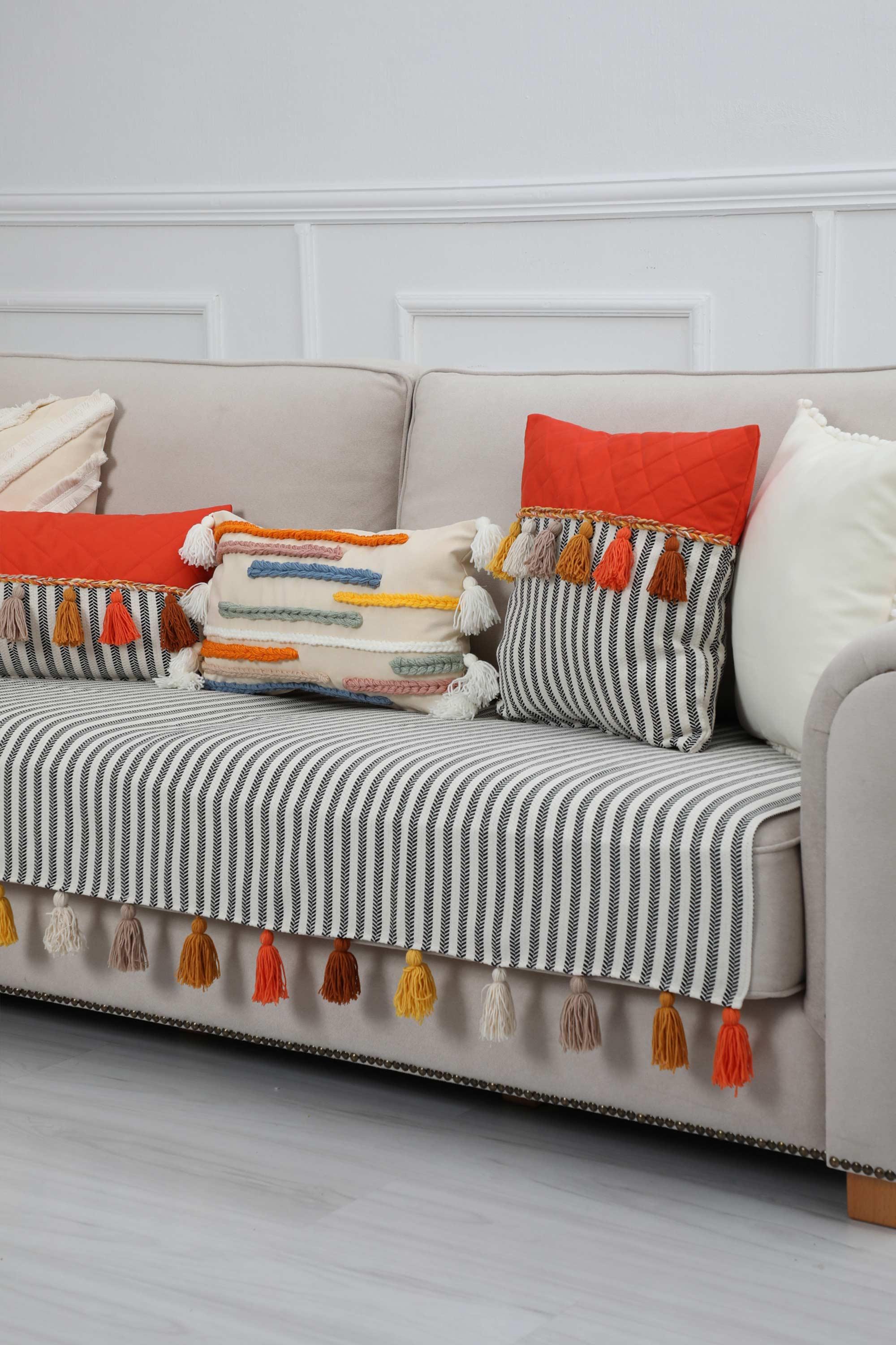 Renkli Püsküllü Koltuk Örtüsü 90 x 210,KO-20 Çizgili Desen-Turuncu
