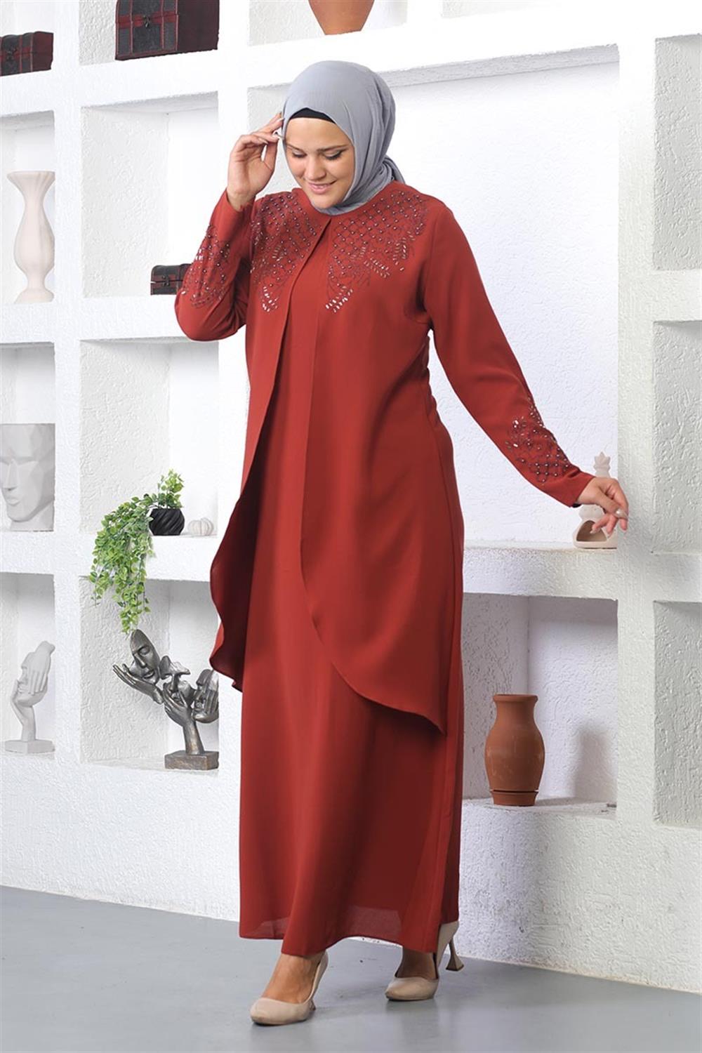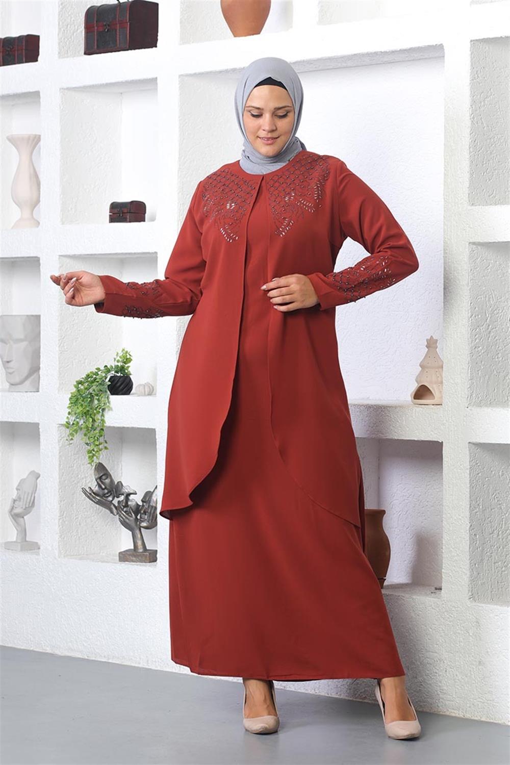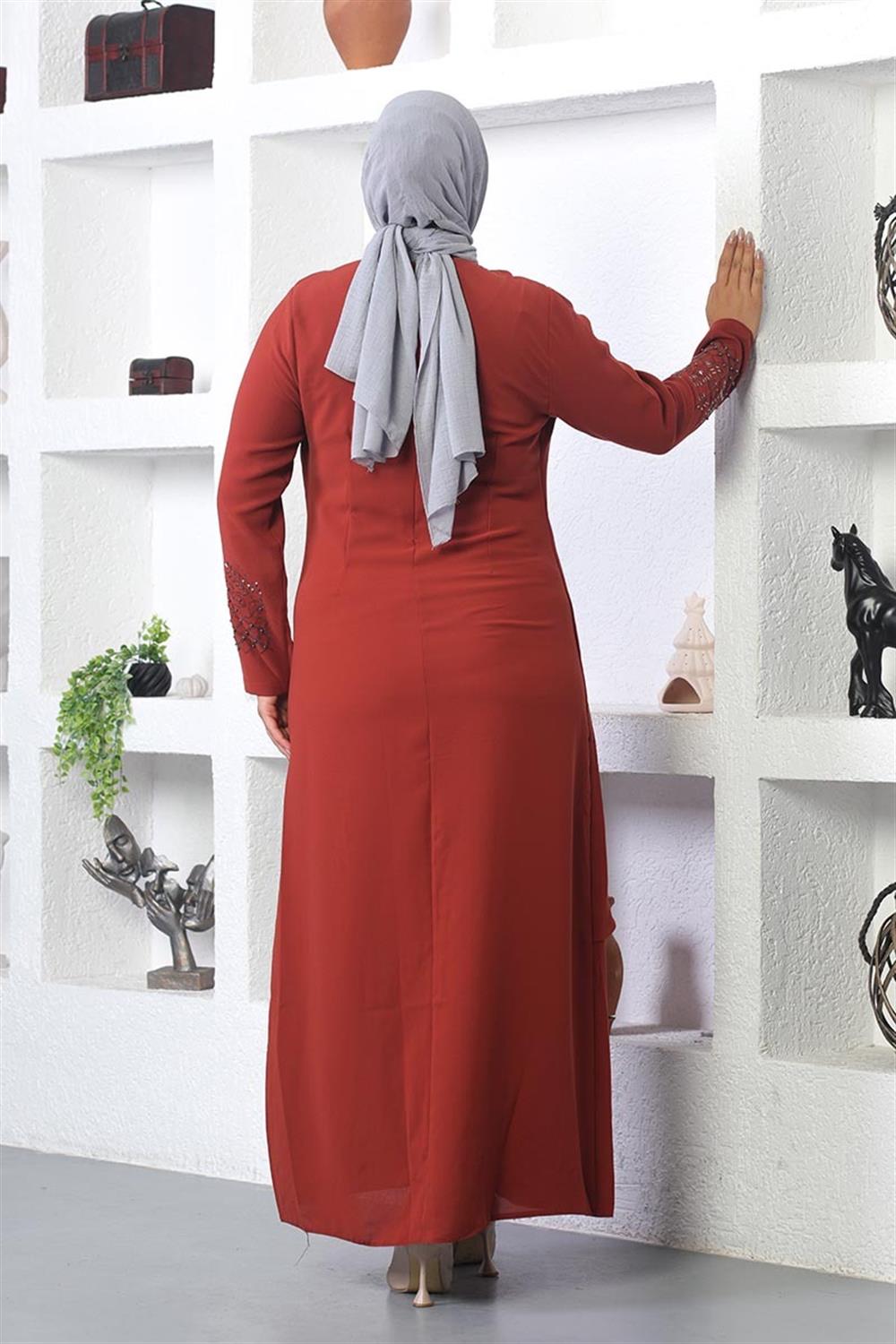 Taş İşlemeli Tesettür Elbise Kiremit- ÜRÜN KODU: 2021