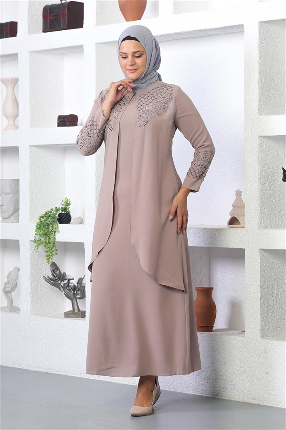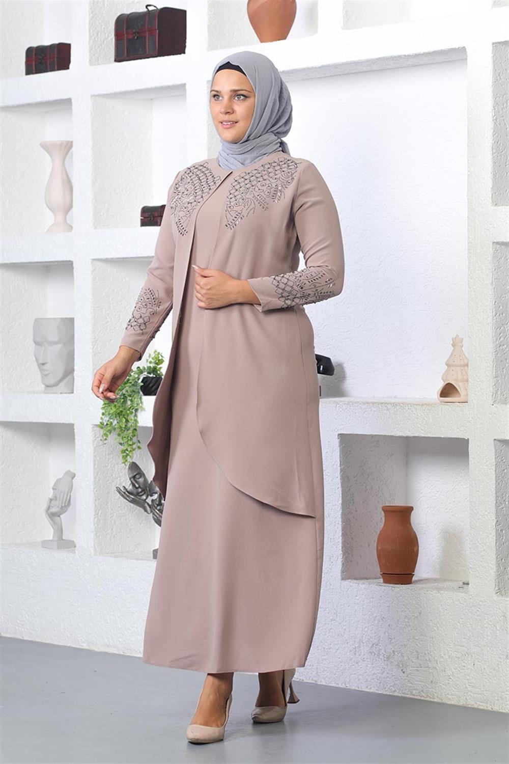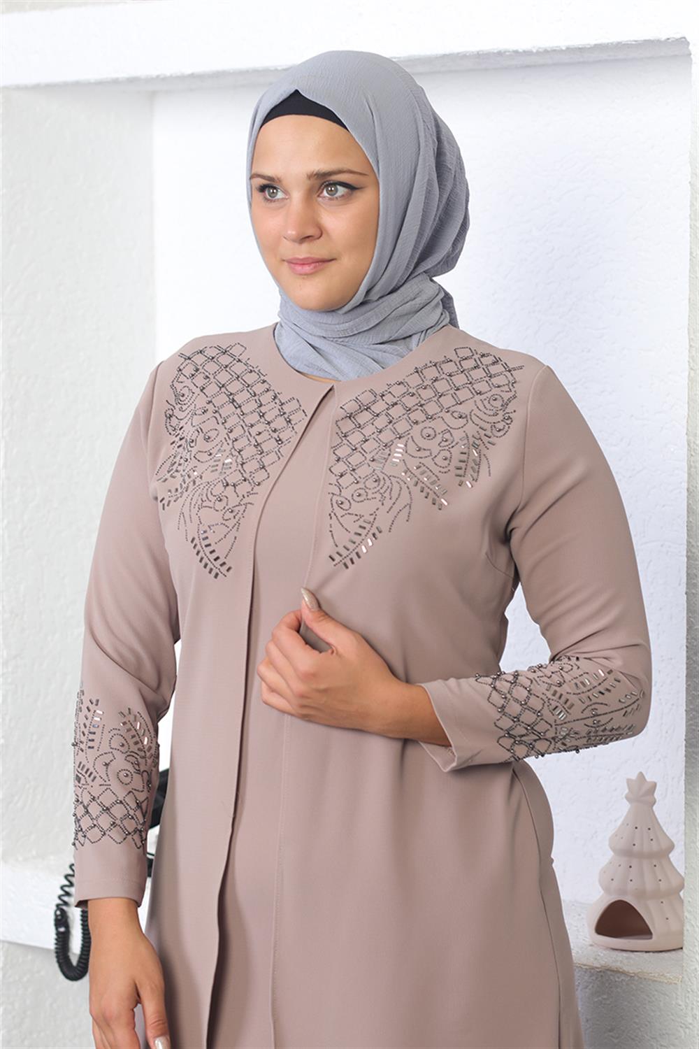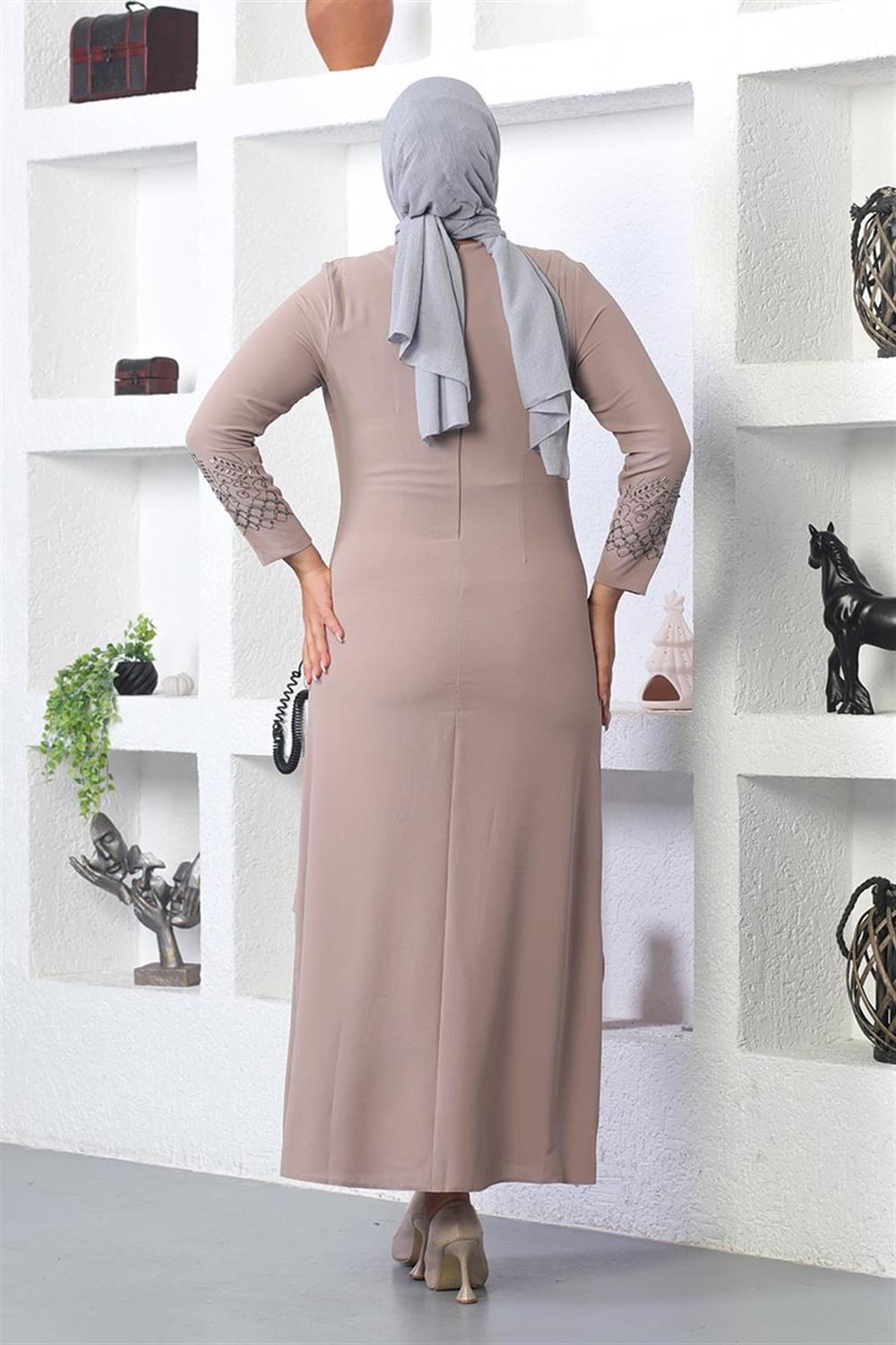 Taş İşlemeli Tesettür Elbise Vizon- ÜRÜN KODU: 2021