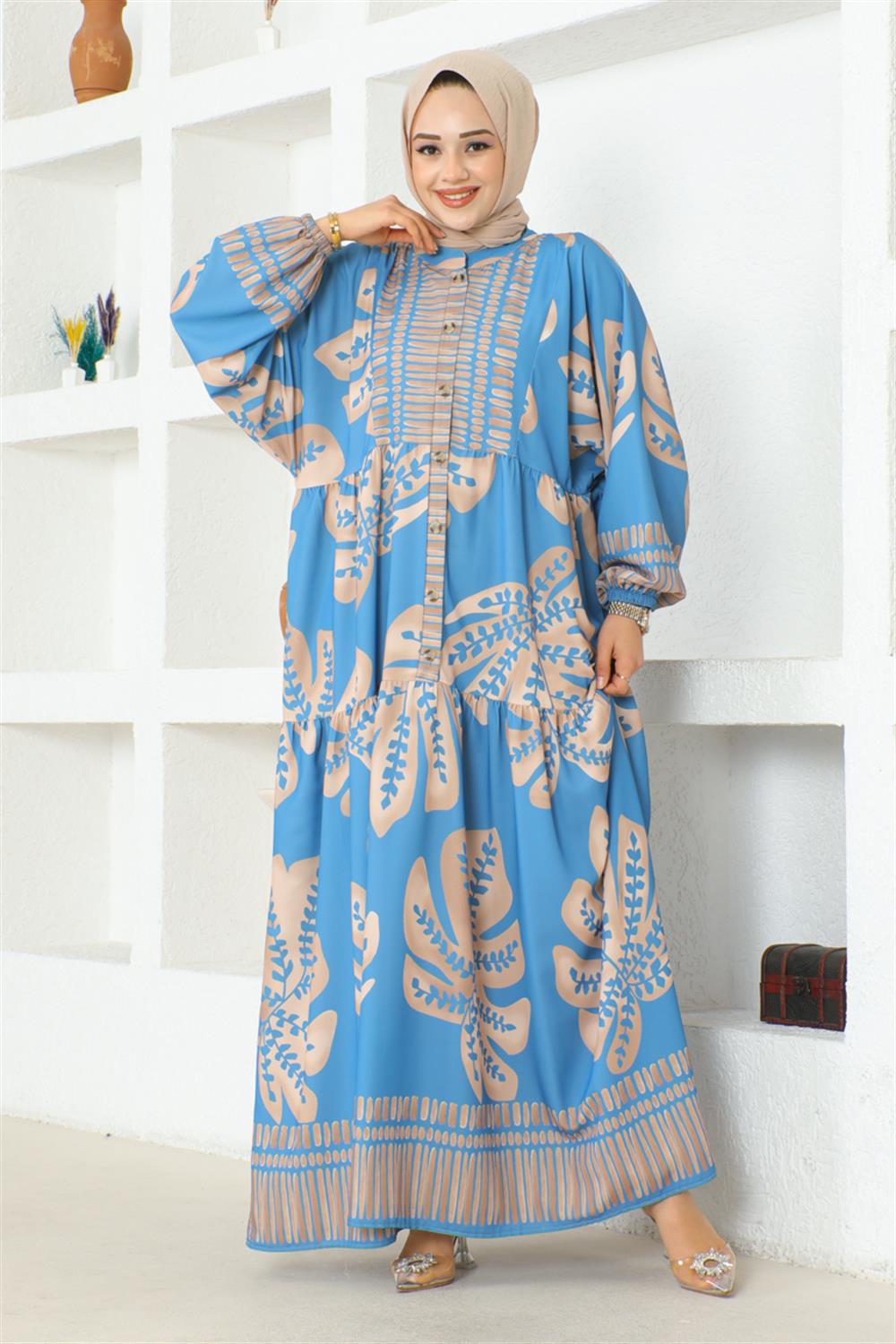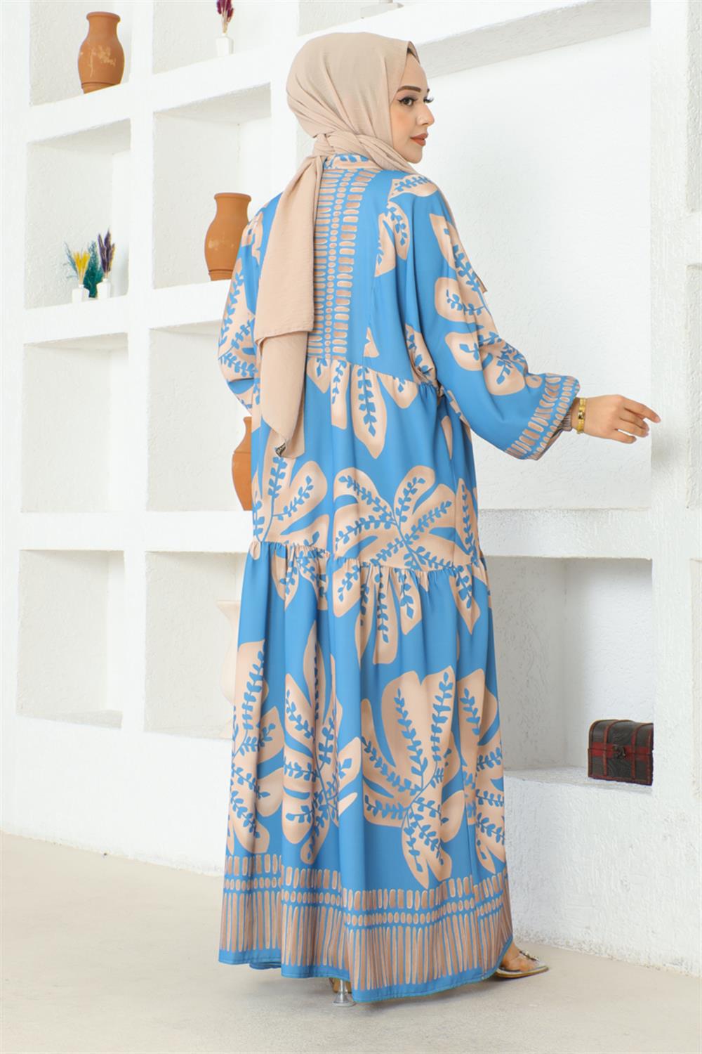 Tropikal Desenli Tesettür Elbise MAVİ
