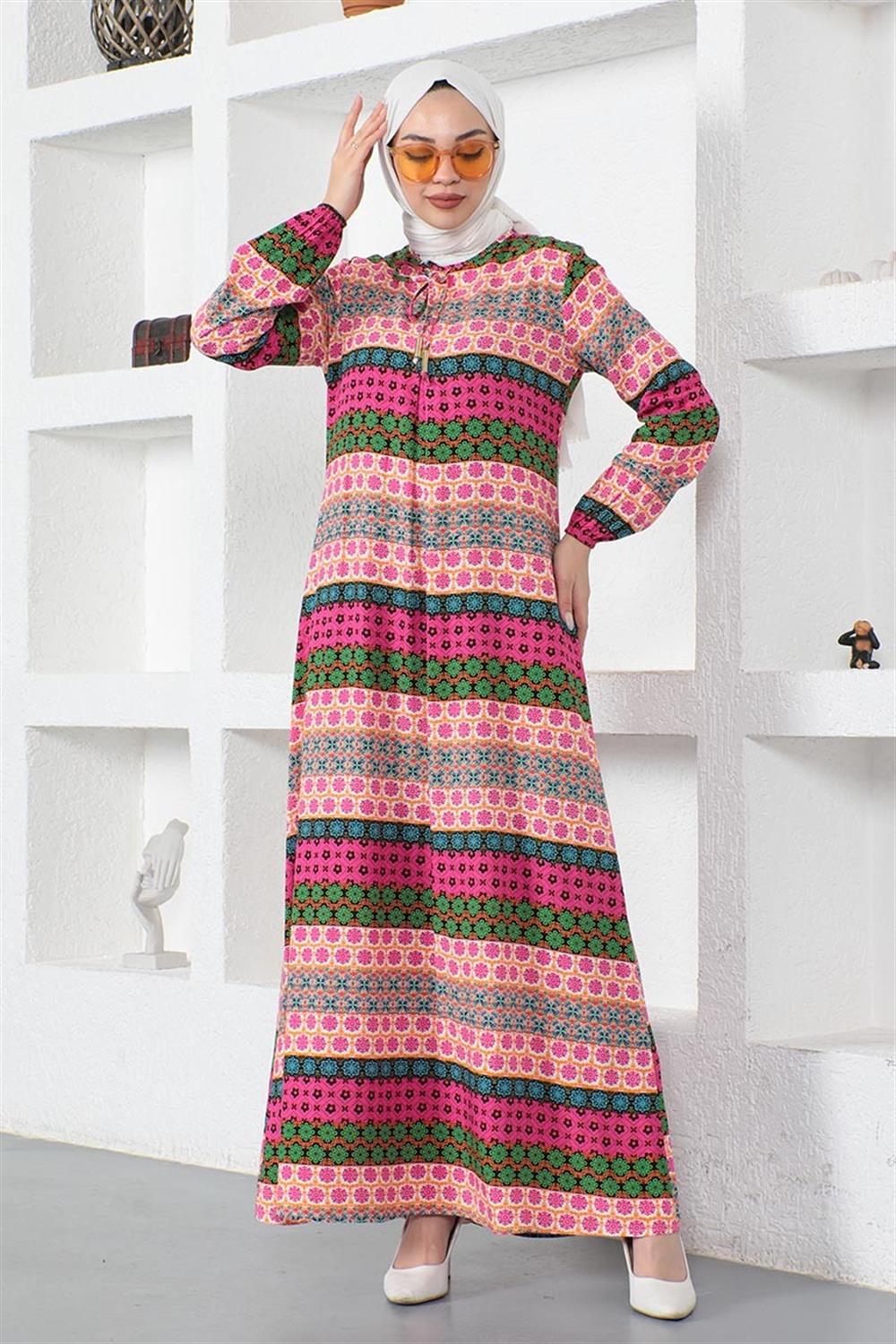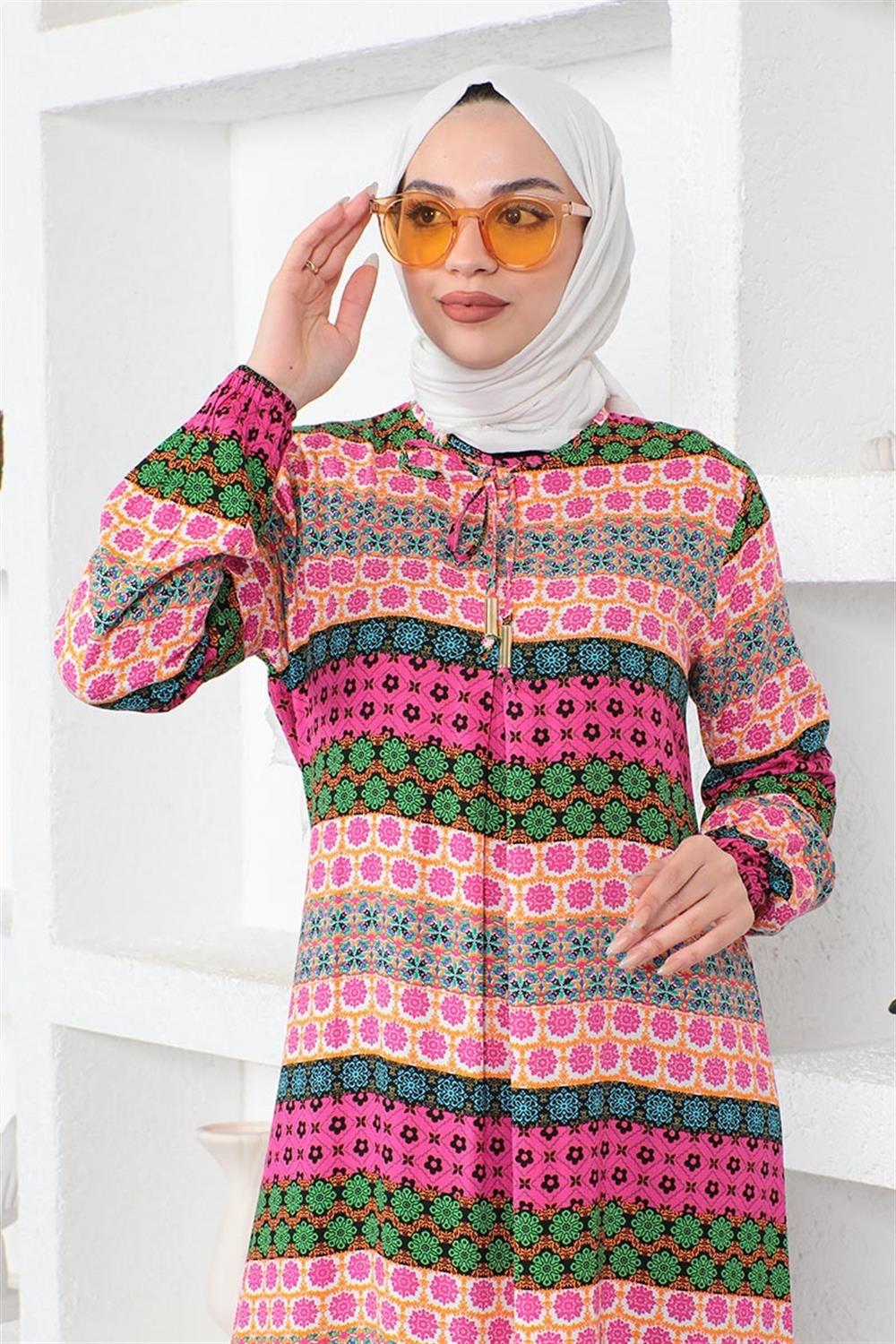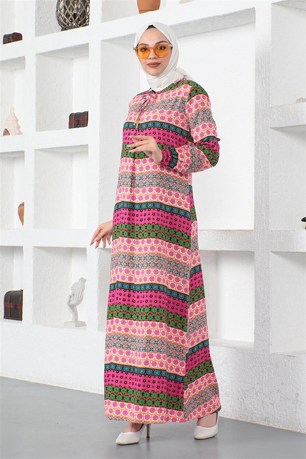 Yakası Bağcıklı Viskon Elbise FUŞYA