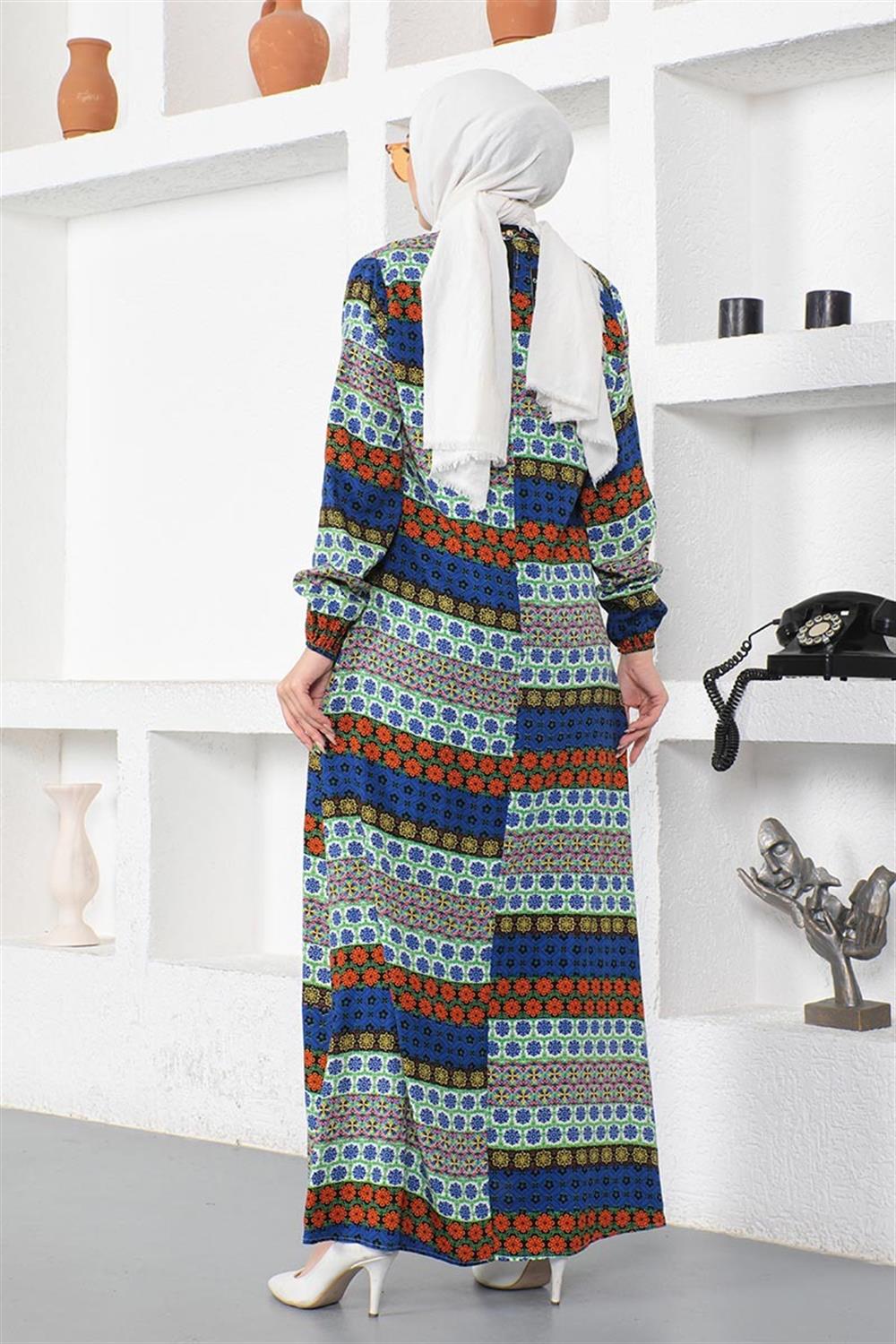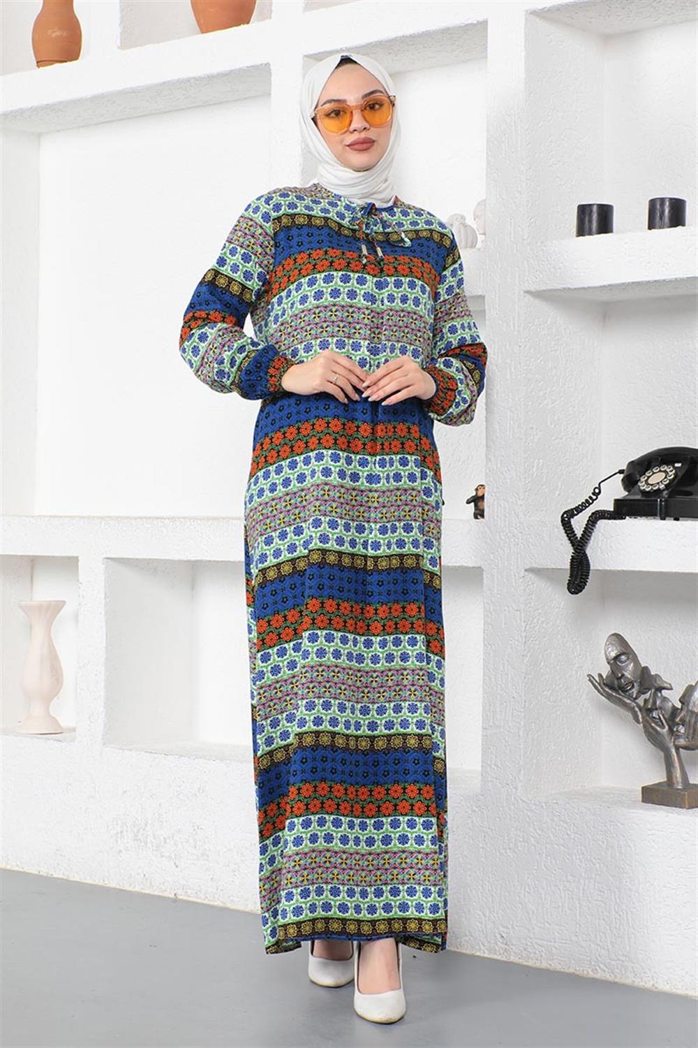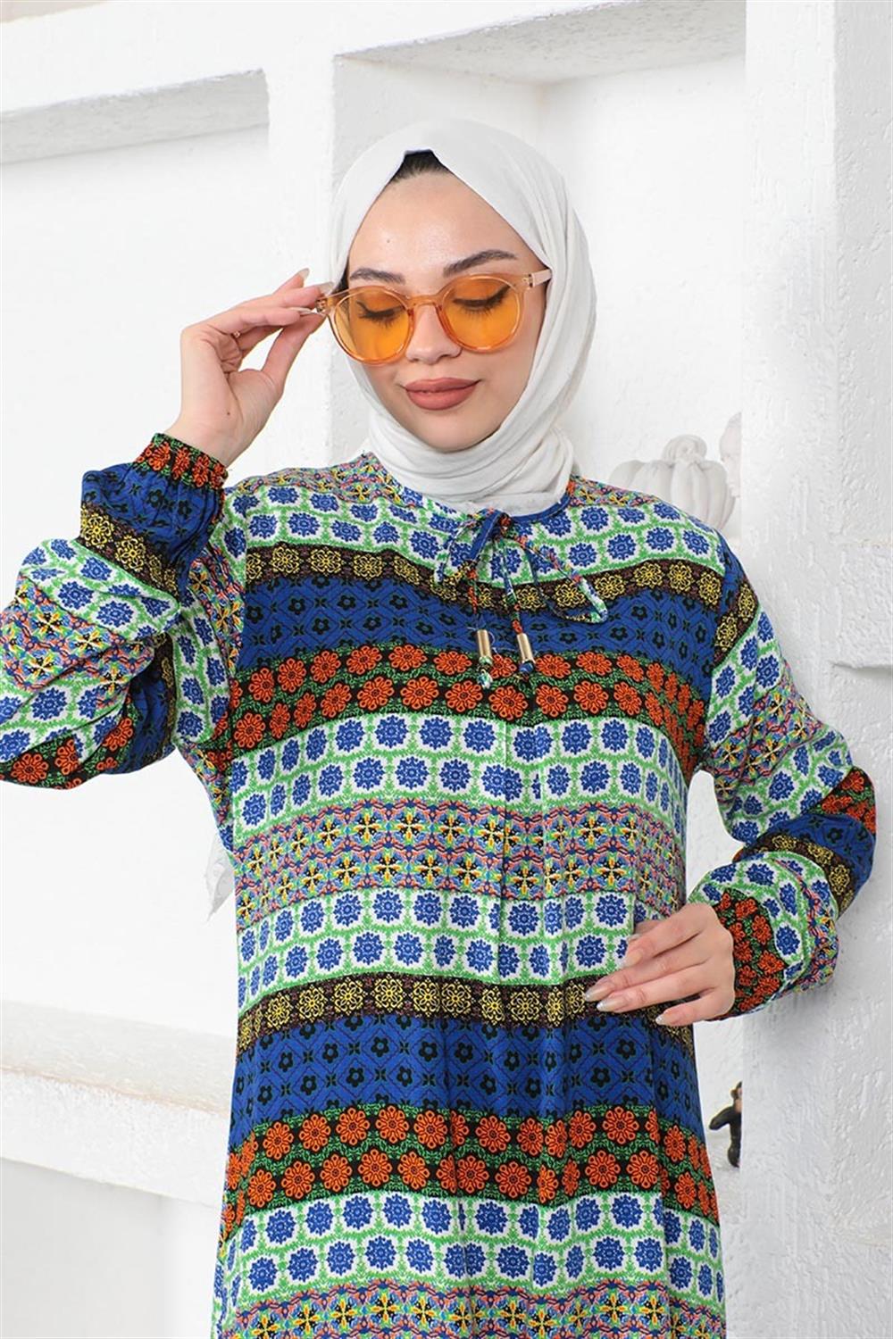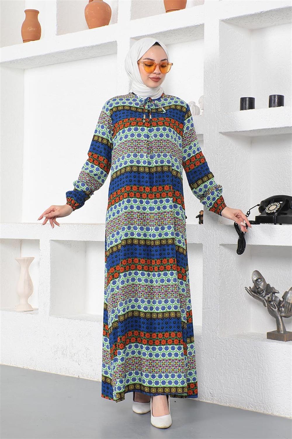 Yakası Bağcıklı Viskon Elbise SAKS MAVİSİ