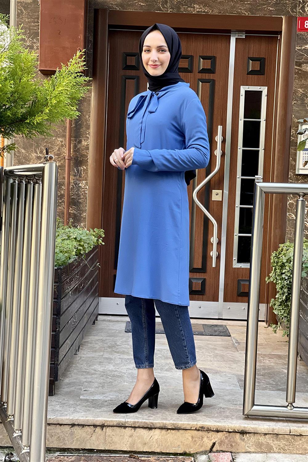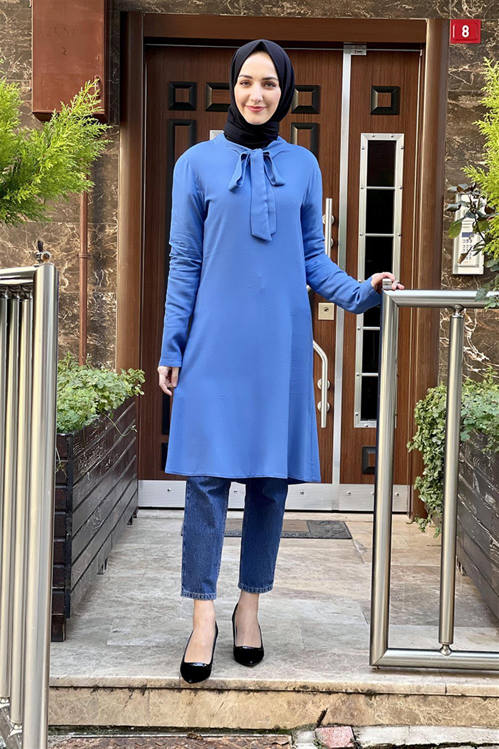 Yakası Bağlamalı Tesettür Tunik İndigo