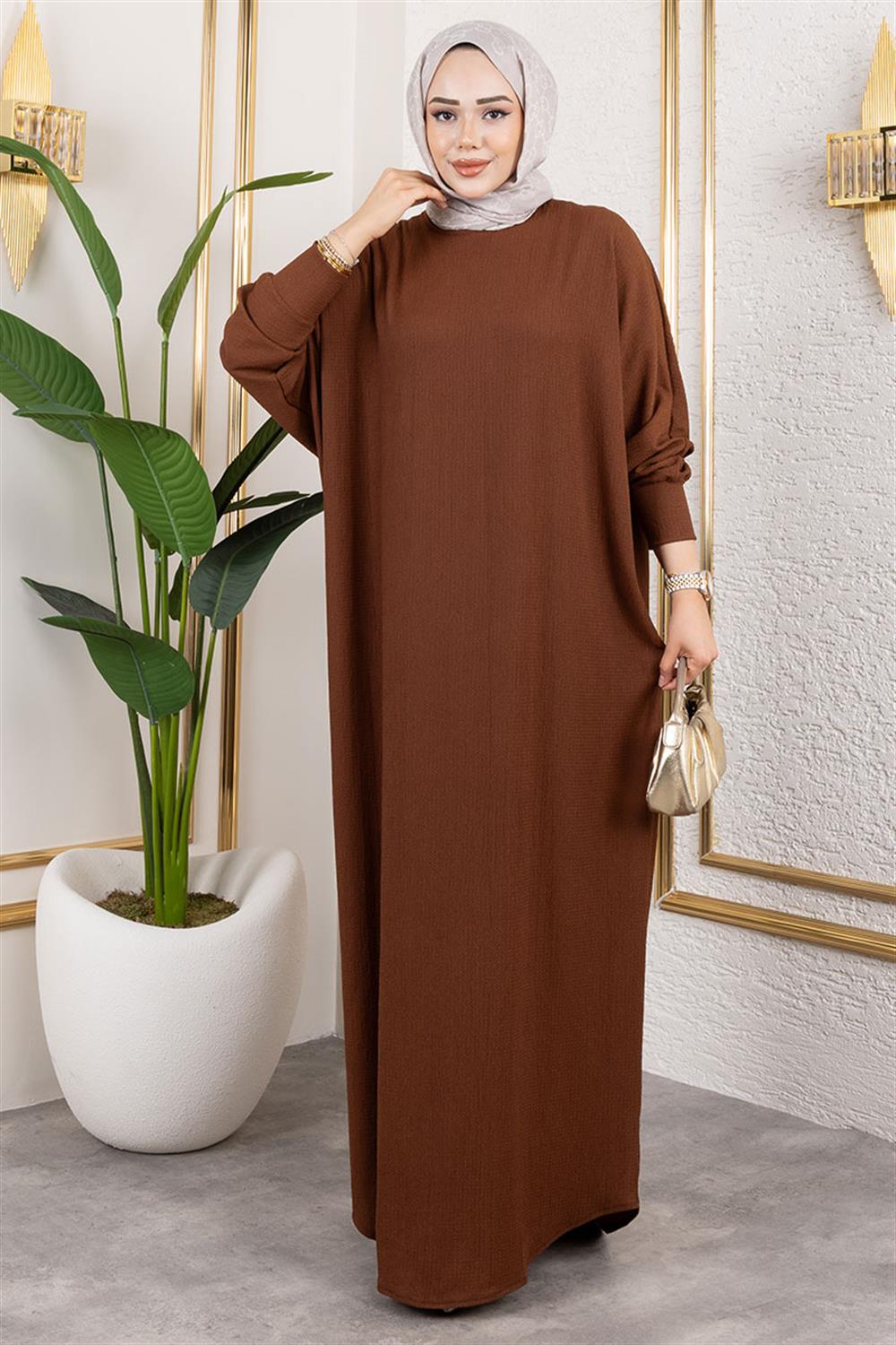 Yarasa Kollu Bürümcük Elbise KAHVERENGİ